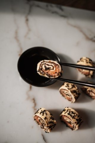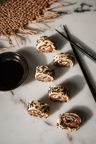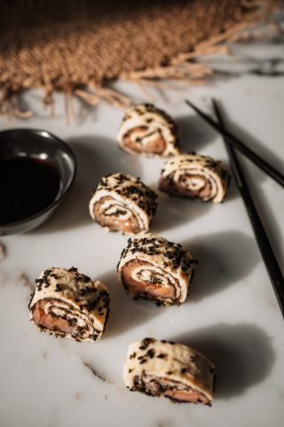 Doe de eieren in een kommetje en klop ze samen met een scheut melk, zout en peper. Verhit de koekenpan en doe een beetje bakboter in de pan. Giet een klein laagje van het eimengsel in de pan zodat je een dun omeletje krijgt. Na een tijdje even omdraaien en dan is hij klaar. Herhaal dit tot je mengsel op is. Smeer de afgekoelde omeletjes in met de roomkaas, leg een blaadje nori erop en haal daar de hoekjes even vanaf zodat hij wat meer dezelfde vorm krijgt als het omeletje en leg in het midden een beetje zalm erop. Nu kun je hem mooi strak oprollen. Strooi wat zwarte sesamzaadjes op een snijplank oid en rol de opgerolde omeletjes erdoorheen. In mooie plakjes snijden, serveren met sojasaus en smullen maar….